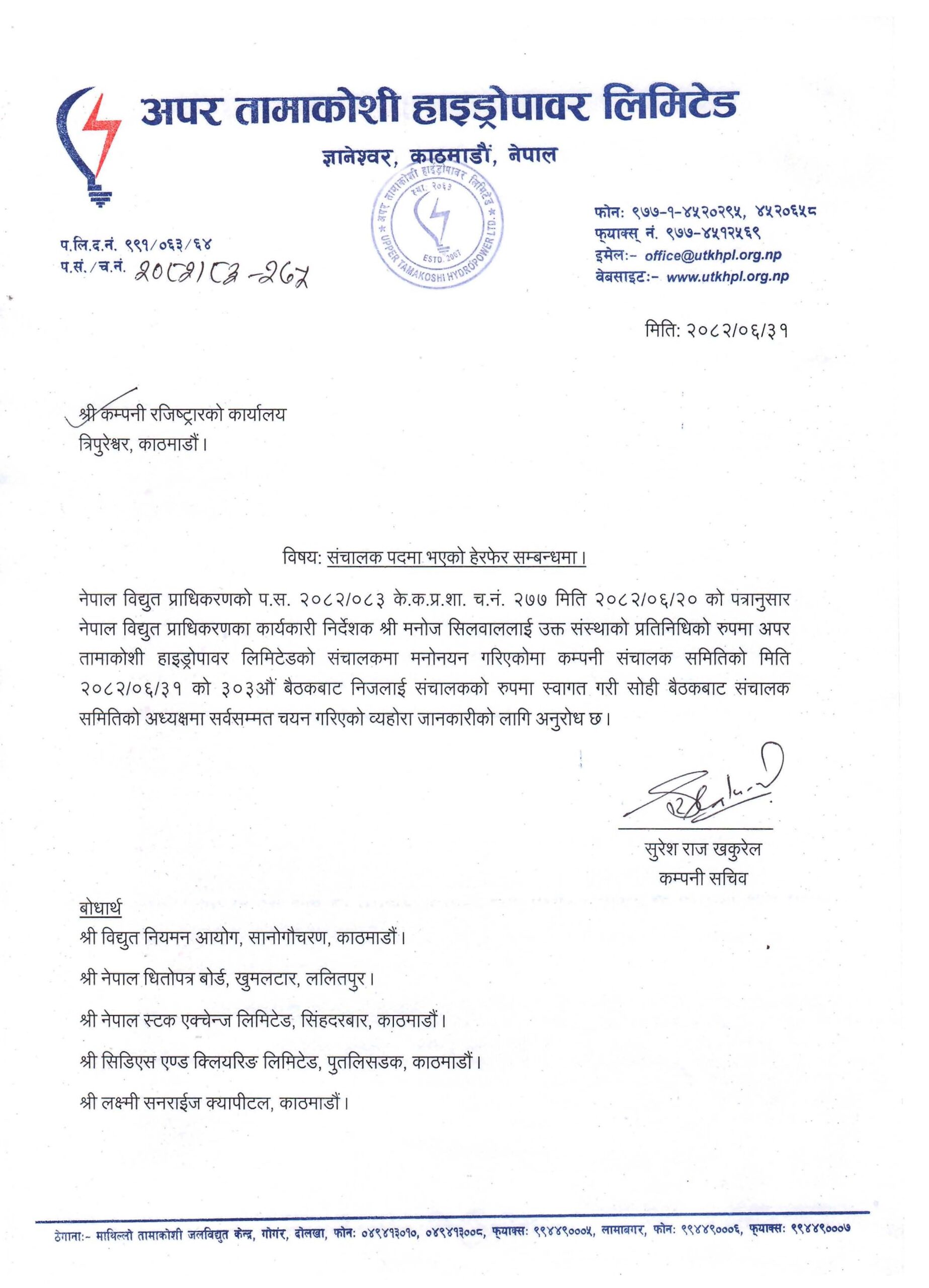 Upper Tamakoshi Hydropower Limited is continuously updating the project's updates to the public